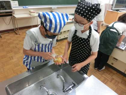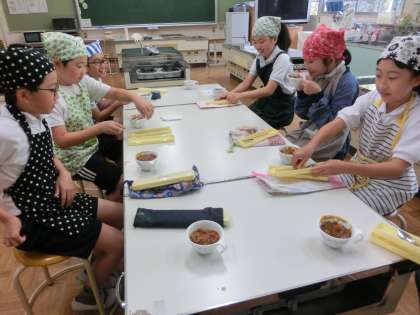 5年生は、今月末に野外学習(キャンプ)を予定しています。野外学習では、薪を使ってカレーを作る予定です。今日は本番に向けて家庭科室でカレー作りの練習をしました。家で作った経験のある子もいますが、ほとんどの子が初めての経験で玉ねぎやニンジン、じゃがいもの切り方、皮のむき方に苦労していました。その苦労のかいがあっておいしくできました。本番もうまくいくといいですね。