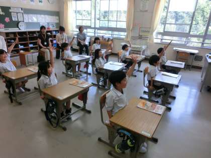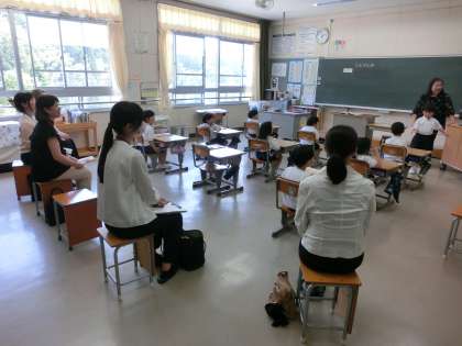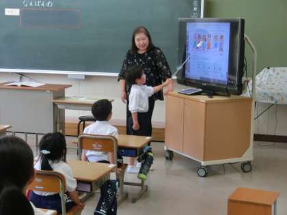 今日は、午後から1年生がお世話になったそれぞれのこども園の先生方が来校されました。1年生の小学校での様子を参観していただきました。算数の時間の参観でした。「まえから何番目?」「まえから何人」などの少し異なった表現について違いを学習しました。後ろで参観されている園の先生方が少し気になりましたが、いつも通り元気に発言して頑張っている姿を見せることができました。