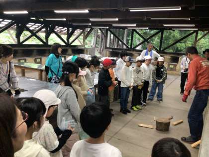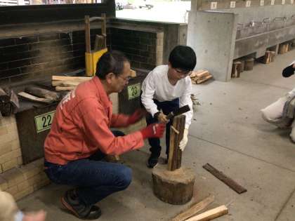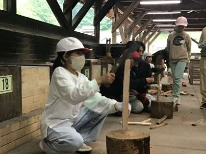 夕ご飯準備は、薪割りからです。交代で薪割りの体験をしました。