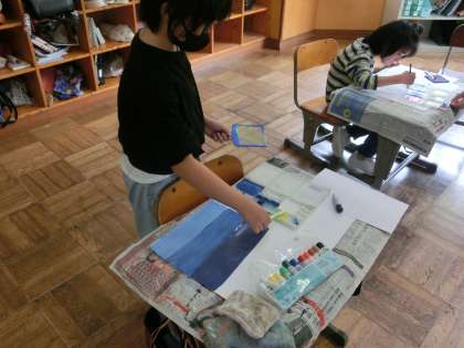 4年生の図工は、絵の具を使ったさまざまな表し方の学習です。絵の具をストローで吹き付けたり、色のついたビー玉を転がしたり、ブラシを網の上からこすって吹き付けるなど、さまざまな手法を使てオリジナルのアート作品を作っていました。どんな作品ができたか楽しみですね。