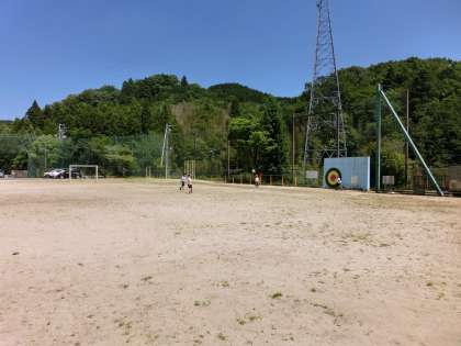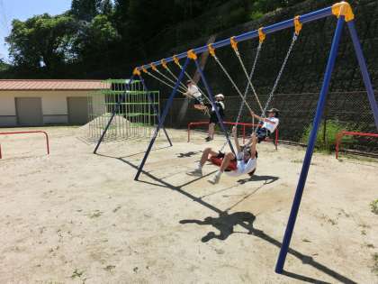 夏らしい太陽になってきました。昼放課は外遊びです。ブランコにゆられて気持ちいいです。男の子はサッカーに夢中です。