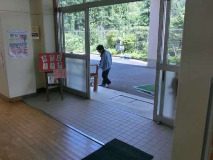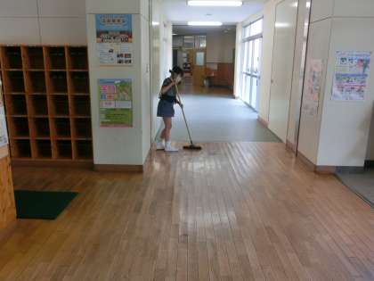 掃除にお時間です。本校は、縦割り班による清掃活動です。上級生も下級生も一生懸命に掃き掃除をしています。昇降口から一歩外に出るととても暑いですが頑張っています。