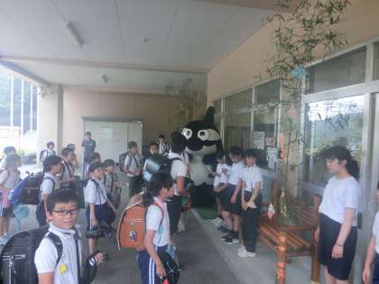 今日の下校時間に合わせてグランパスくんがやってきました。全校で大きな声で「グランパスくーん」と呼ぶと大きなグランパスくんが現れました。グランパスくんは幸海小学校のみなさんが大きな声であいさつができるようにという願いでやってきました。