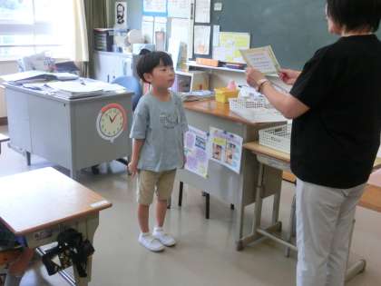 今日は1年生の元気もりもり賞の表彰です。1年生は2名の児童が表彰対象になりました。おめでとうございます。