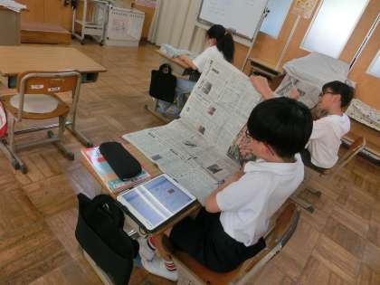 5年生の国語科は新聞を持ち寄って様々な記事から内容を読み比べる学習をしています。