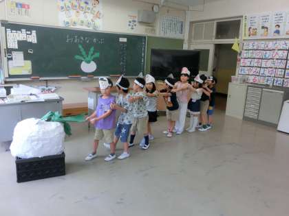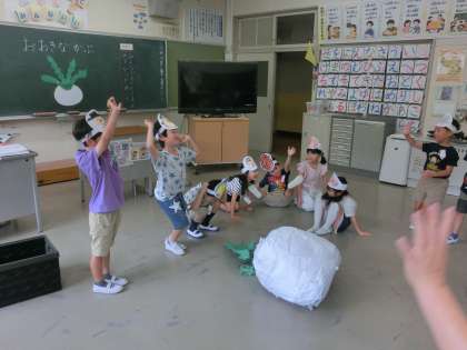 夏休み前の最終日となりました。1年生では、国語の時間です。「大きなかぶ」をみんなで役割を分担をして演じました。今年の1年生は、人数がたくんいるため、先生たちの応援を借りることなくみんなで協力して演じることができました。