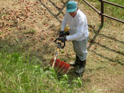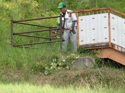 今朝から校内整備員さんは校内の除草作業を行っています。今日は、草だらけの運動場の整備をしていただきました。整備員さんには、夏休みにも来ていただき、学校再開に向けて通学路の整備をしていただきました。