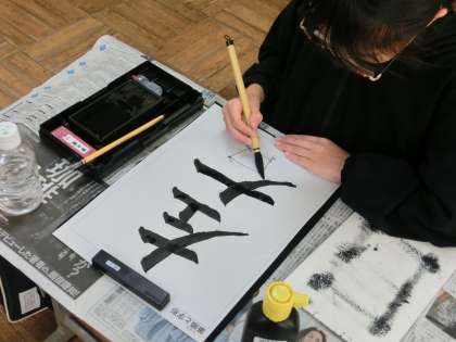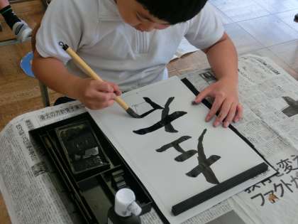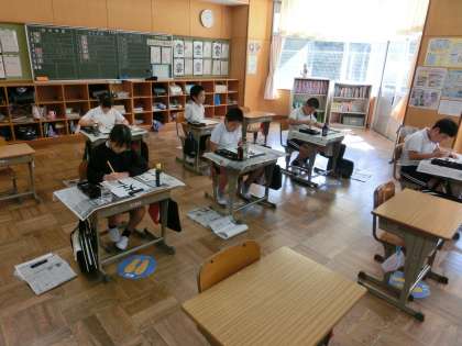 4年生は、書写の時間です。手本を見ながら一画、一画ていねいに書いていました。