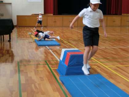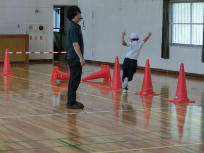3・4年生の体育です。今日も外は猛暑で活動ができないようです。体育館でミニサーキットトレーニングです。