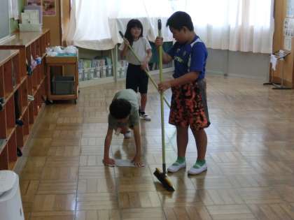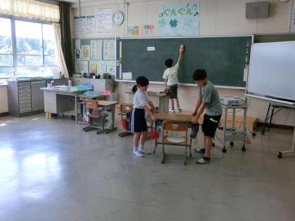 今日は、遅い時間の更新となりました。掃除の時間の様子です。本校では、1年生から6年生までの異学年が協力して清掃活動を行っています。机の移動も1年生と6年生が協力して運んでいます。助かりますね。