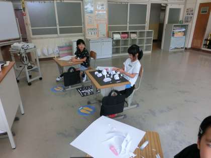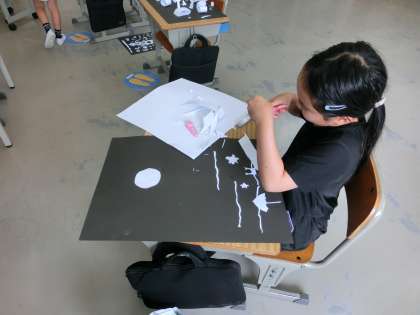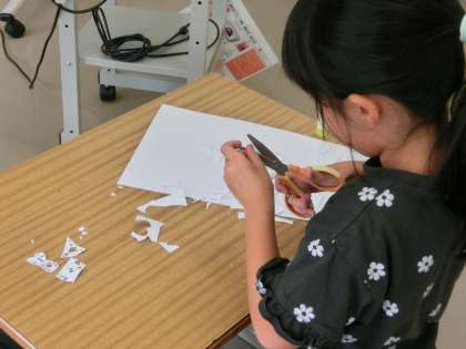 2年生の図工は切り絵です。細かく切った画用紙を黒い台紙に貼って作品を作っています。細かな切込みを入れるのみ夢中です。また、立体的な作品に挑戦をしている子もいました。