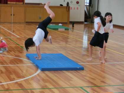 3・4年生の体育は、マット運動です。側転の練習をしていました。子どもたちの前で見本を見せてあげたのですが、足がつりそうになりました。