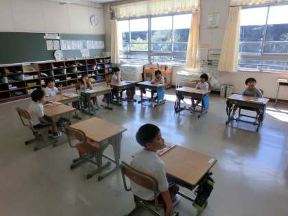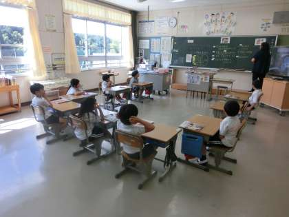 1年生の道徳は、コの字の隊形で道徳に授業です。活発な意見交換をしているようです。