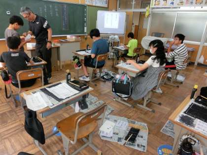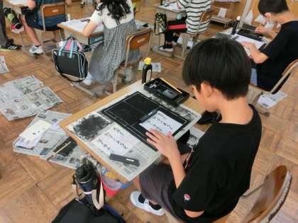 修学旅行を来週に控えた6年生です。落ち着いて書写、毛筆に「取り組んでいます。今日は、いつも大きさの半紙ではなく、小さめの用紙に書く練習です。いつもは大きく書いている毛筆の時間ですが、小さな文字を筆を使って書くことに少し苦戦しているようです。