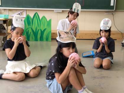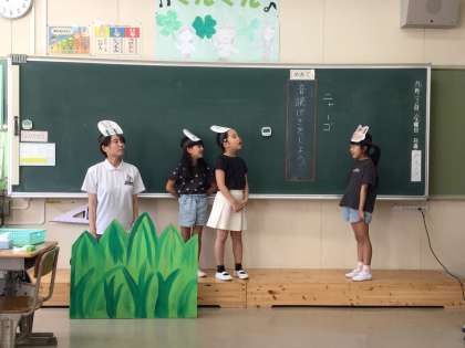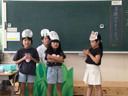2年生は、ここ数日、音読劇の練習をしていました。いつ発表会をするのか楽しみにしていると突然招待してくれました。3人で役割を交代しながら元気に演じていました。手作りの大きなモモをみんなでむしゃむしゃ食べているシーンがおもしろかたったです。最後は、ニャーゴにみんなのモモ分けてあげるやさしいネズミさんでしたね。