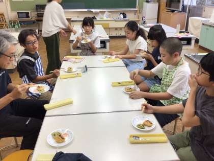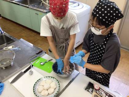 5年生は、米づくり体験など、米について様々な学習をしています。朝一で足助のライスセンターに出かけ、帰ってきて米を原料としたお菓子づくりに挑戦です。今日は2種類をつくり試食会まで行いました。大根と米粉を練り合わせた不思議な食感のおもちとクッキーです。調理中からは想像できない美味しさでした。