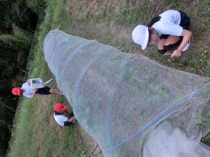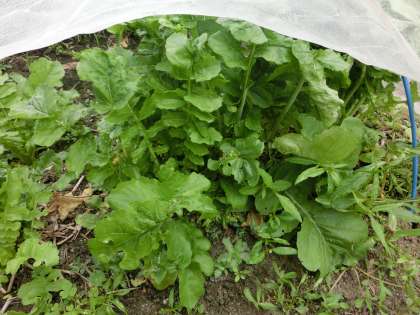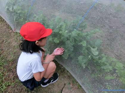 曇り空の朝、2年生は、大根畑に出かけました。先日、芽が出たばかりなのに虫に食べられて減ってしまっていましたが、先生や地域講師のの方のお世話で少しずつ増えてきました。