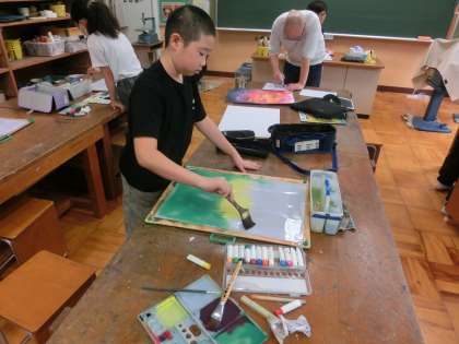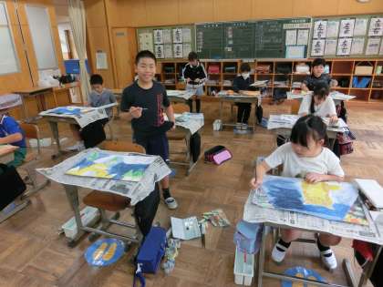 同じ時間、4年生と5年生は図工の時間です。読書感想画制作の追い込みです。どの学年も今まで学習したいろの塗り方の手法を使って色塗りをしていました。子どもたちが過年度に学習した技を駆使して作品制作に取り組んでいる姿には関心しました。