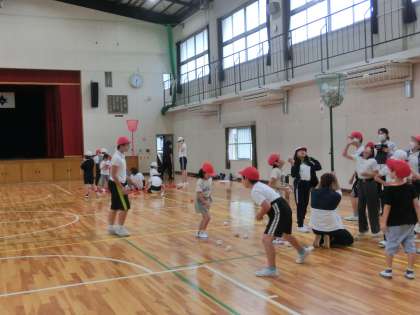 わくファミ活動(縦割り班)を行いました。運動会が近いということで、今日も縦割りの班で活動を行いました。今日は、新しく届いた玉入れ用のかごを使って運動場で行う予定でしたが、あいにくの雨天のため、体育館で行いました。6年生がリーダーとなって作戦を考えながら取り組んでいました。