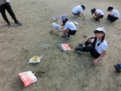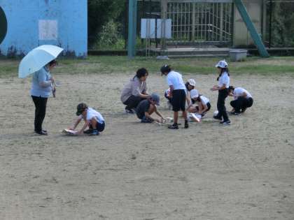 金曜日の5時間目。3年生が運動場で集まって草取りをしていると思い、様子を見に行くと理科の実験でした。ちょうど太陽が顔を出してきたタイミングで地面の温度を測っていました。「遠くから草取りありがとう」と声をかけると測定の合間に草取りをしてくれました。優しい3年生でした。観察はうまくいったのかな。