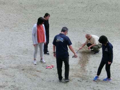 週末の金曜日です。いよいよ来週から運動会の練習が始まるということで、児童のみなさんの下校後全職員で運動場ライン引きを行いました。ラインを引く前に昨年度記をつけたポイントの確認作業から始めました。1年たつと地中に深く埋まってしまい探すのが大変でした。来週から運動会に向けて練習をがんばりましょう。