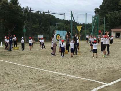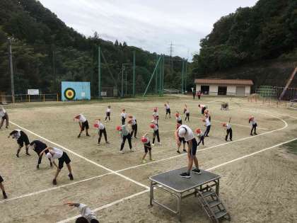 今日から、運動会に向けて全校練習が始まりました。最初にラジオ体操で体をほぐして、1時間目は綱引き、2時間目は玉入れの競技の動きを練習していきました。