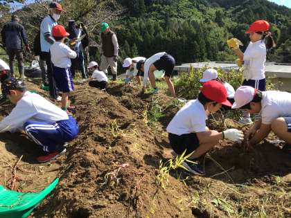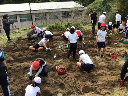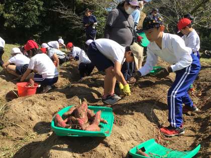 春の苗の植えつけから168日目になります。芋掘りをしました。班ごとに分かれて分担された場所みんなで掘りました。開始早々に、大きなイモがとれ、歓声があがりました。今年も豊作のようです。1時間の活動でたくさんのイモが収穫できました。