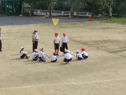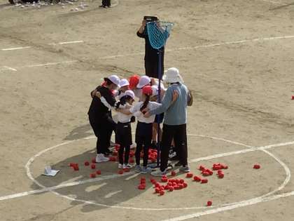 綱引きに続いて2時間目は、玉入れの練習です。ファミリー班対抗の玉入れ、今日は初めて運動場での練習になります。これまでの練習から今日は6年生がそれぞれ作戦を練ってきました。競技の練習の前に作戦会議をし下級生に一生懸命説明をしていました。さて、作戦通りにできたのでしょうか。