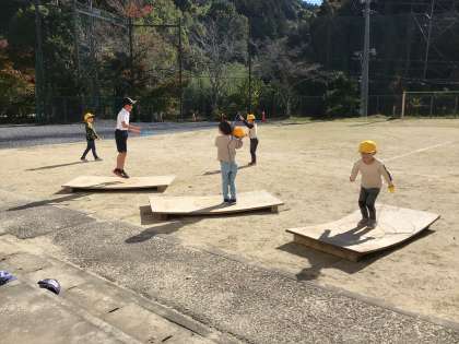 すばらしい天気になりました。なかよしタイムはみんなでなわとびです。低学年の子は、ジャンプ板の上での練習です。地面より高く跳べるので、気持ちよくジャンプができるようです。