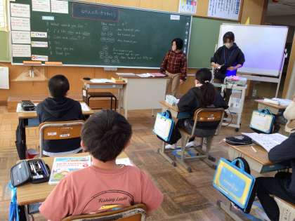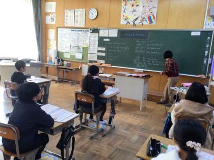 5年生の外国語は、ALTの先生の来校日です。今日は、英語を使って買い物時の値段の言い方の学習をしています。