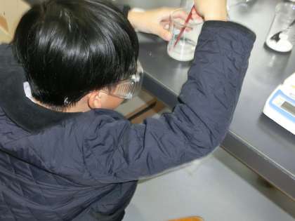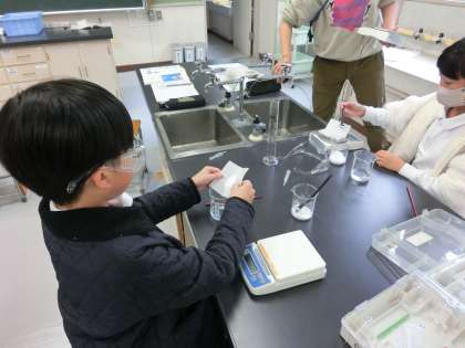 5年生の理科は、ものの溶け方の実験です。同じ量の水にミョウバンと食塩を少しずつ溶かしていきながらどれだけ溶けるか調べていました。どのくらい溶けたでしょうか。