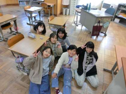 お昼休みの一コマです。何やら女の子集まって楽しそうにおしゃべりをしています。カメラを向すぐのすぐにポーズです。なかよし女子会です。