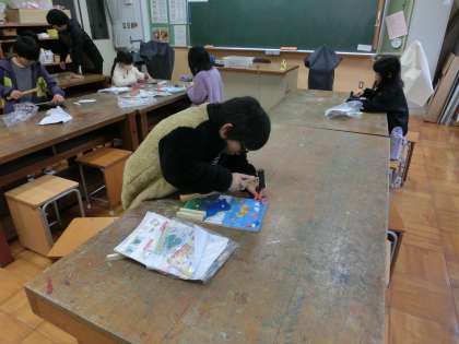 3年生の図工は、たくさんのくぎを打ってビー玉ゲームを作っていました。上手に打てなくてくぎが曲がってしまうこともありますが、根気よくくぎ打ちに取り組んでいました。どんなゲームができるか楽しみですね。