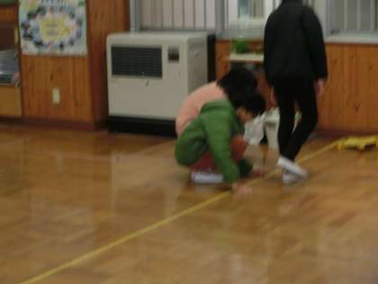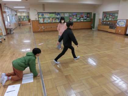 5年生の算数は、平均の求め方について学習をしています。今日は、廊下に巻き尺を伸ばして、巻き尺に沿って何度か歩き、自分の歩幅を計算する学習です。
