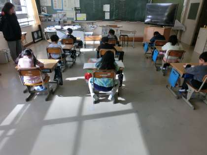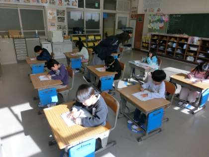 1年生は、久しぶりに全員そろっての学習です。今日は、書初めの練習です。姿勢よくみんな真剣に取り組んでいました。