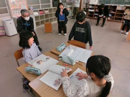 5時間目、2年生の教室では、国語の研究授業を行いました。3年生は、3人だけですが音読から始まり、グループでの話し合いあり、実演発表など盛りだくさんの内容でした。また、たくさんの先生方に見守られての授業でしたが、たくさん発表もできすばらしい授業でした。