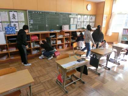 4年生の教室では、教室の片付けです。ロッカーや自分の机の中の整理整頓です。この後のお楽しみ会が楽しくできるように準備しています。