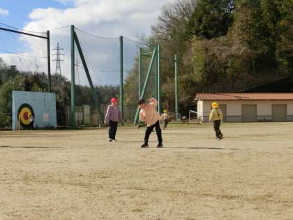朝の冷え込みは厳しかったですが、青空が広がり子どもたちは元気に外で走り回っています。カメラを向けると「ハイポーズ」とカメラ目線です。低学年が鬼ごっこをしていましたが、後半は6年生の数人が加わり楽しく遊んでいました。