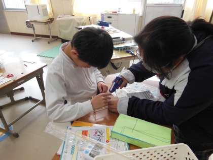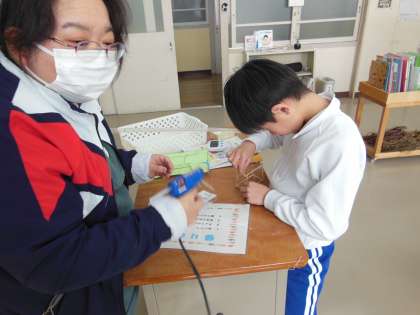 さちのみさんの教室の前を通ると何やら先生と工作をしていました。工作の時間で何か作っているのかと思ってのぞいてみると算数の時間でした。竹ひごをつかって直方体を組み立てていました。夢中になっている姿には感動です。