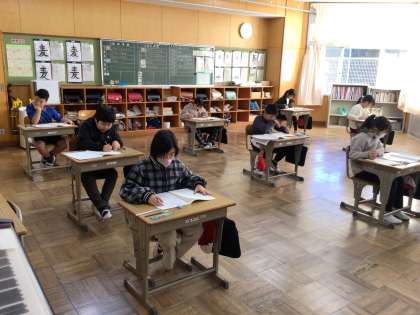 今、学力検査を行う期間中です。今日は、全校が取り組む国語と3年生以上が取り組む理科です。どの子も、真剣な顔で問題を解いていました。