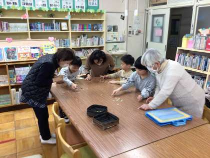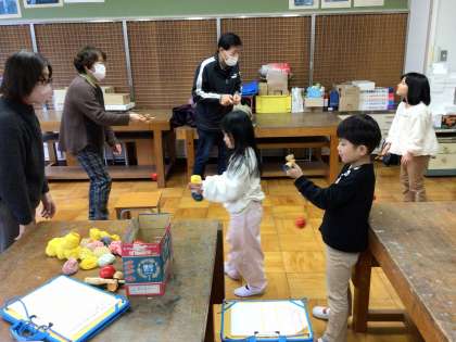 1年生が昔遊びに挑戦しました。こま回しやおはじき、あやとり、けん玉にお手玉。昔はよくやったなあ、という遊びを、地域のおじいさん、おばあさんと一緒に楽しみました。うまくいったり、いかなかったりでしたが、楽しい時間を過ごしました。