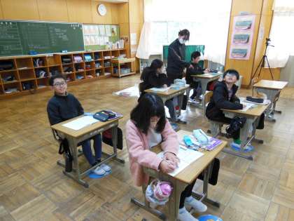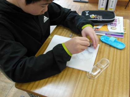 5年生の算数は、コンパスを使って多角形を書く練習をしています。コンパスで長さを測り、ずれないように慎重に描いていました。早くできたのかなカメラ目線になっています。