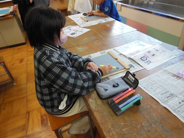4年生の図工の時間です。今日から彫刻刀を使って版画の制作です。今日は、初めて彫刻刀を使って彫る練習です。角刀や丸刀などを順番に試していきます。初めて使用する刃物などみんな恐る恐る使っていました。怪我をしないようにいい作品を作ってくださいね。