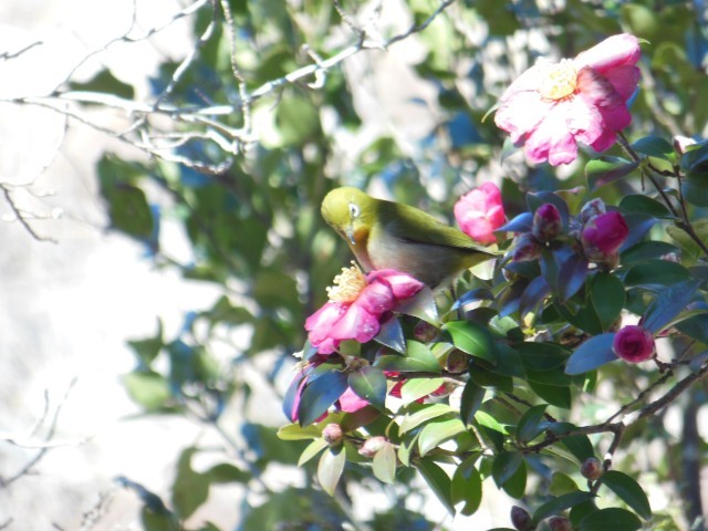 厳しい寒波が峠を越したように今日は、まぶしいぐらの日差しです。幸海ふれあいパークのサザンカには、メジロが花の蜜をついばむ姿が見られました。少しずつ春が近づいています。