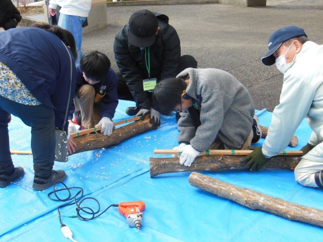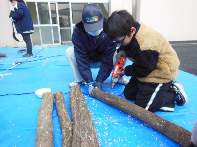 3年生は毎年恒例のしいたけの菌打ち体験を行いました。豊田市森林組合の職員、地域のボランティア、保護者、共働本部コーディネーターのたくさんの方の協力で活動をすることができました。子どもたちにとって電動ドリルを使用するのは初めてで、恐る恐る原木に穴を開けていました。段々慣れてくるともっとやりたいという声も聞こえてきました。早くても2年後にしか収穫できないしいたけです。大切に見守っていきたいです。約2時間近くの活動でしたが、楽しく貴重な体験ができました。