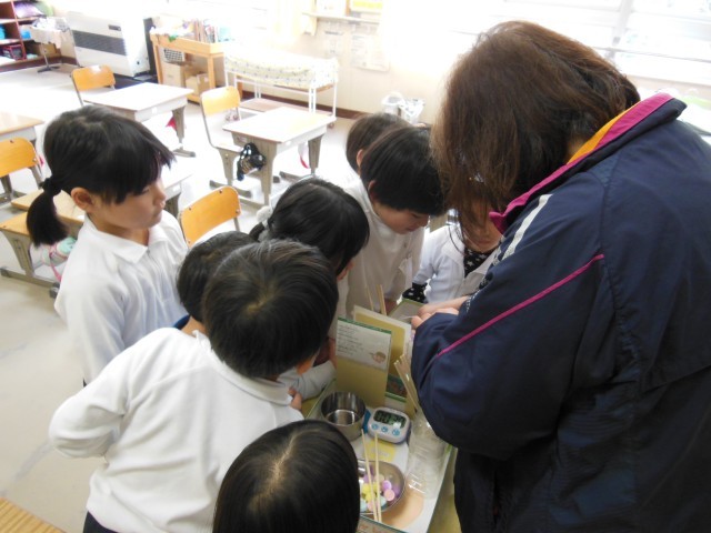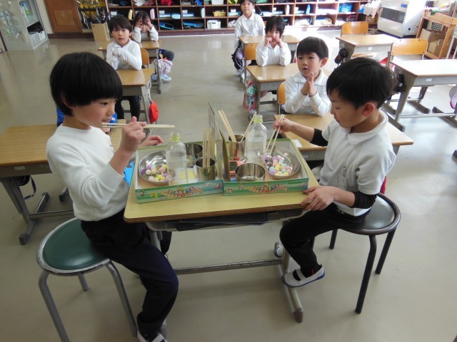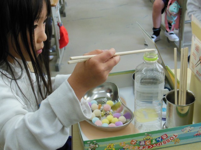 今週も今日で終わりです。金曜日の午後の授業の様子から1年生を紹介します。5時間目は、保健の先生考案の「箸使いにチャレンジ」というゲームです。箸が上手に正しく使用できるか、ゲーム感覚で楽しんでいます。ビー玉やビーズ玉、毛玉などサイズの異なる玉を箸を使って制限時間内にどれだけ移動できるかを競います。サイズによってポイントが異なります。各学年順番に回ってきました。金曜日は最終日です。1年生のゲーム大会は1点を競う盛り上がりのある時間でした。これを機にお箸がもっと上手に使えるといいですね。
