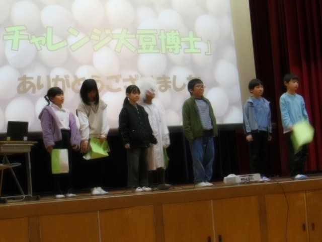 3年生は、1年間栽培し、観察してきた大豆のことについて発表しました。大豆の育て方から栽培中の苦労、発見などを楽しく発表しました。