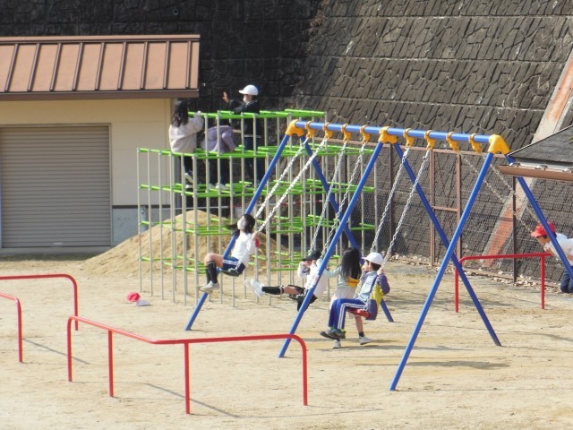 学習発表会を終え、子どもたちは今日も青空の下で元気いっぱいに遊んでいます。よーく見ると1年生は鉄棒にチャレンジしています。その他、サッカーにブランコ、ジャングルジムなどほとんどの児童が外遊びをしているようです。