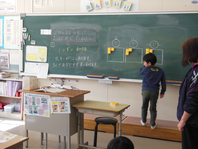 今日も1年生の教室では元気いっぱい手が挙がっていました。算数の時間です。ブロックを使って分ける学習です。みんな発表がしたくて元気いっぱいに手を挙げていました。