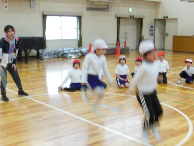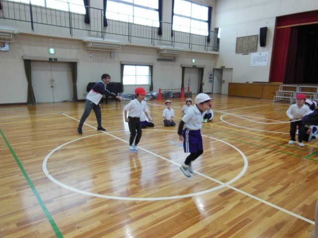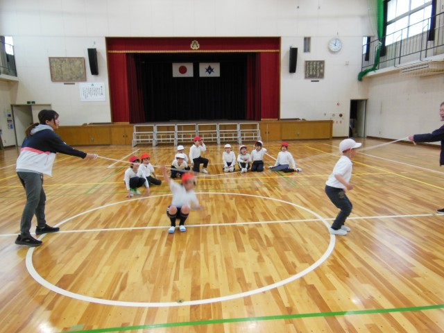 1・2年生の体育は、大縄跳びです。2人組を作って交代で跳んでいました。みんなで掛け声かけながら楽しく跳んでいる姿が見られました。